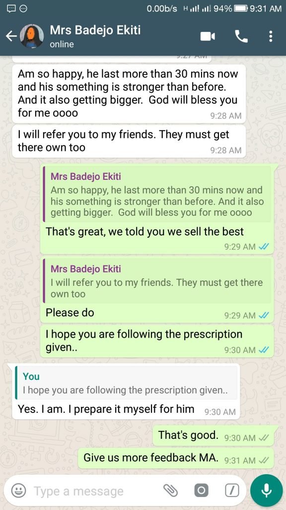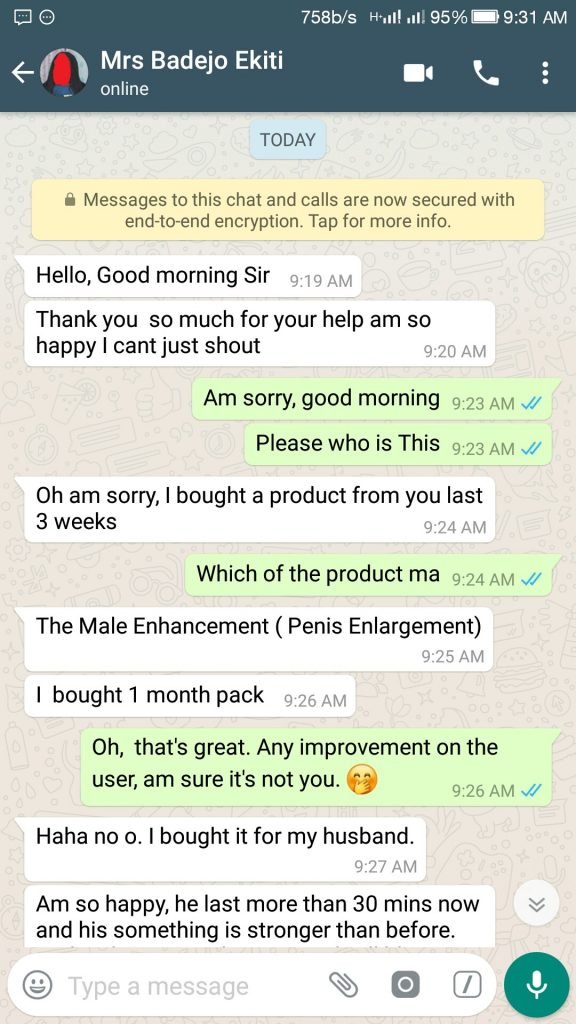 So I kept searching. The whole story change when A long time friend of mine who is based Abroad, introduced me to a set of three very Powerful products for overcoming any Sexual Related Problems using only natural methods, so I went ahead to use it.